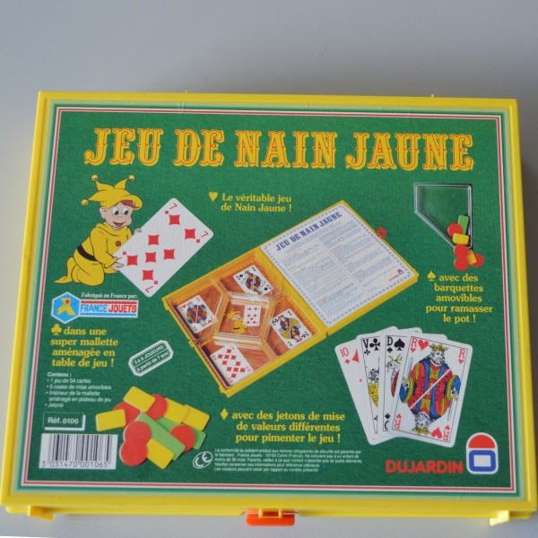 Comprendre le fonctionnement du jeu. Avant de pouvoir briller au Nain Jaune, vous devez maîtriser les règles de base. Transmis de génération en génération depuis le XVIIIe siècle, ce jeu se compose d'un plateau à cinq compartiments (les séries), chacun dédié à une carte spécifique : le valet de carreau (le nain jaune), le 7 de carreau, le 8 de coeur, le 10 de pique et le roi de.. 24,58 € HT. Le Nain Jaune est un grand classique des jeux de cartes. Le Nain jaune est un jeu de hasard raisonné où il faut gagner des jetons en recevant des mises et en défaussant ses cartes avec des suites allant de l'as au roi. En stock. Ajouter au panier.
